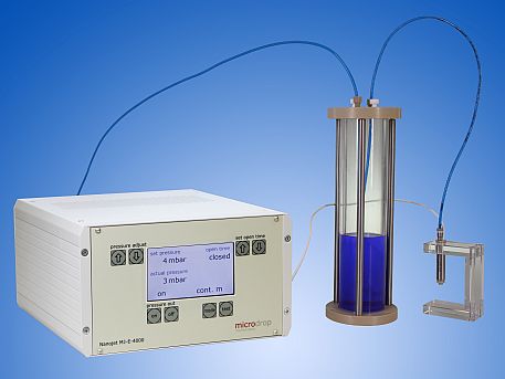 Nanojet Dispenser Heads feature a miniaturized solenoid valve and a glass capillary nozzle through which the liquid is emitted. The liquid is transported from the reservoir to the dosing head by means of gas pressure.